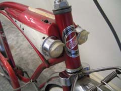 Rare Columbia Fire-Arrow 2-speed middleweight. Candy Apple red and white two-tone with chrome. Good condition for it’s age. This is a scarce bike that has a lot of style and is bound to become a sought after collectors item in the near future. The “bug eye” tank gives this bike a very distinctive look. Front and rear spring-loaded carriers ad some bling to an already flashy bike.